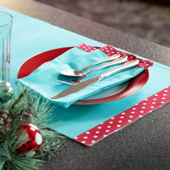 - Featuring a bright blue hue with red & white polka dotted ends, this table runner is sure to grab attention during your Christmas gathering
