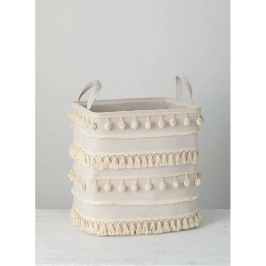 A place for everything; and everything in its place – this charming pom-pom basket brings fun and functional style to any room in the home. Crafted of natural cotton elements; this piece is perfect for stowing away blankets; accent pillows; and even a few magazines.