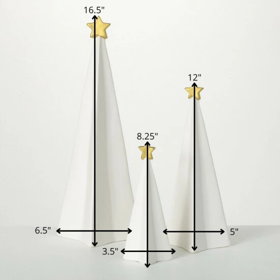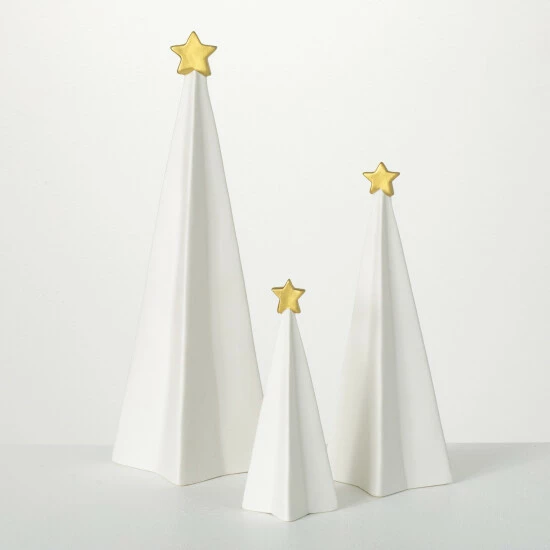 With geometric design & prismatic appeal, this trio of trees add a modern look & feel to today’s home. Three-dimensional white porcelain pyramids are shaped in a three-dimensional form and topped with gold stars. This instantly on-trend option are perfect for the mantle, bookshelf or any tabletop Over the last 52 years, Sullivans has become an industry leader in home decorations. Our brand is rooted in tradition while incorporating modernized trends to keep your home looking up to date with timeless style. Here at Sullivans, we pride ourselves on creating product designs focused on quality and value, ensuring that our customers have access to beautiful products at reasonable price points.