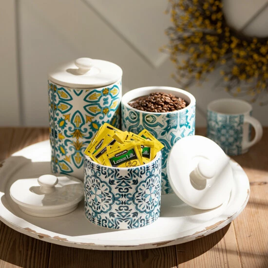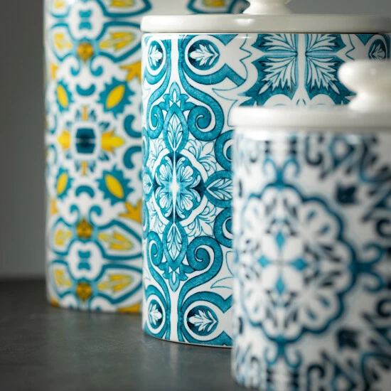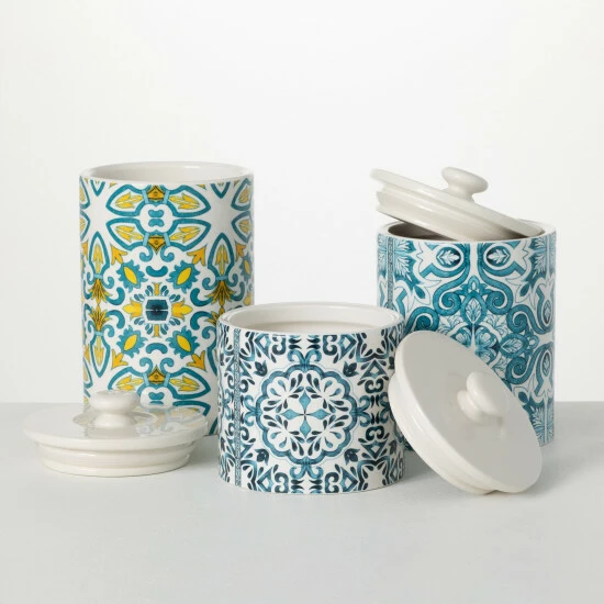 Engulfed in a Portuguese panache of pattern and color, this set of three kitchen canisters will liven up your countertop in an instant. Graceful and charming at the same time, this trio celebrates a range of character not typically found in such a simple household necessity. Over the last 52 years, Sullivans has become an industry leader in home decorations. Our brand is rooted in tradition while incorporating modernized trends to keep your home looking up to date with timeless style. Here at Sullivans, we pride ourselves on creating product designs focused on quality and value, ensuring that our customers have access to beautiful products at reasonable price points.
