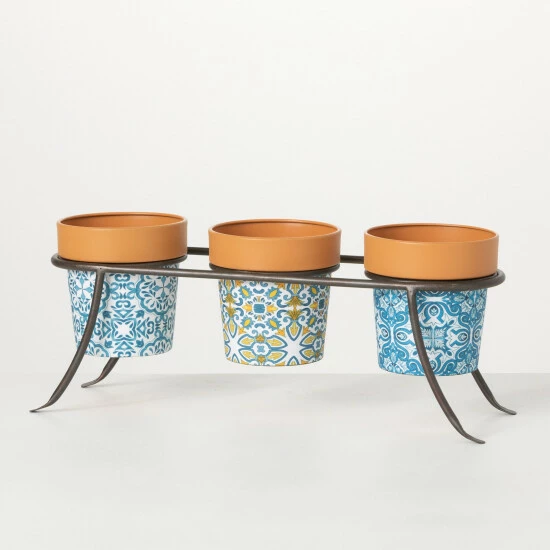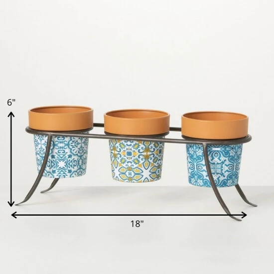 For a stunning statement of straightforward form and design, we suggest this metal stand holding a trio of terracotta-style planters. Framed in metal with each pot featuring a patterned exterior, this combination stands 6″ tall and 18″ wide. Portuguese inspired. Over the last 52 years, Sullivans has become an industry leader in home decorations. Our brand is rooted in tradition while incorporating modernized trends to keep your home looking up to date with timeless style. Here at Sullivans, we pride ourselves on creating product designs focused on quality and value, ensuring that our customers have access to beautiful products at reasonable price points.