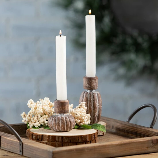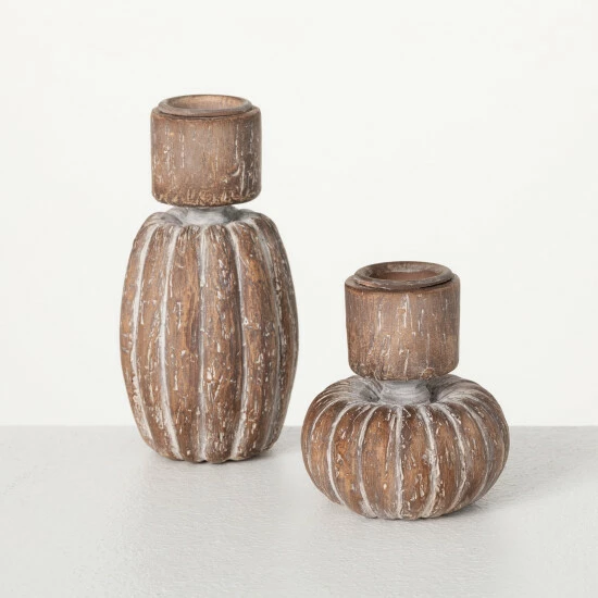 Ideal for dressing up the table for seasonal family get-togethers & memorable meals, this pair of pumpkin-shaped taper candlestick holders look simply stunning. Sculpted from lightweight resin & finished to look like hand-carved wood. Over the last 52 years, Sullivans has become an industry leader in home decorations. Our brand is rooted in tradition while incorporating modernized trends to keep your home looking up to date with timeless style. Here at Sullivans, we pride ourselves on creating product designs focused on quality and value, ensuring that our customers have access to beautiful products at reasonable price points.