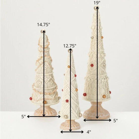 - The trees in this set measure 5″L x 5″W x 19″H; 5″L x 5″W x 14.75″H; 4″L x 4″W x 12.75″H