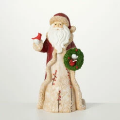 - This Santa is crafted or resin and is holding a cardinal and a wreath