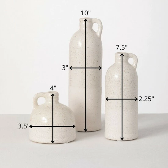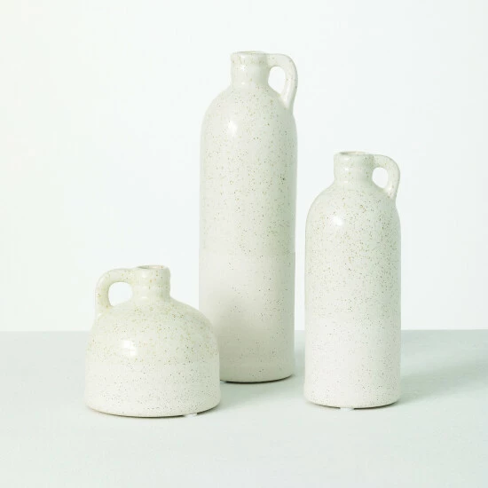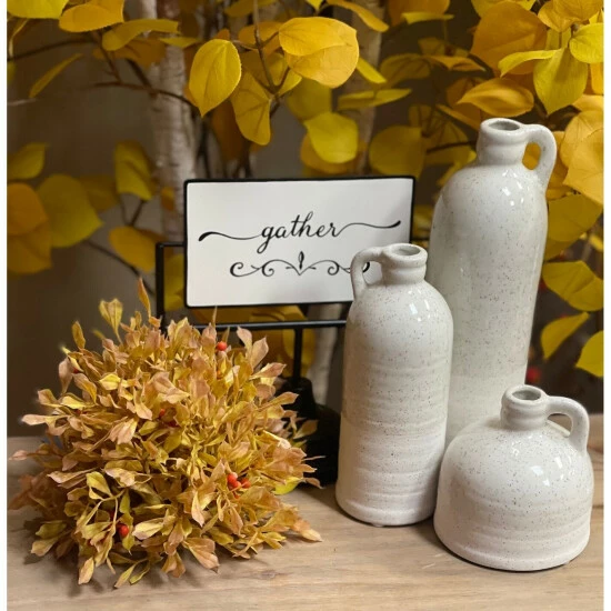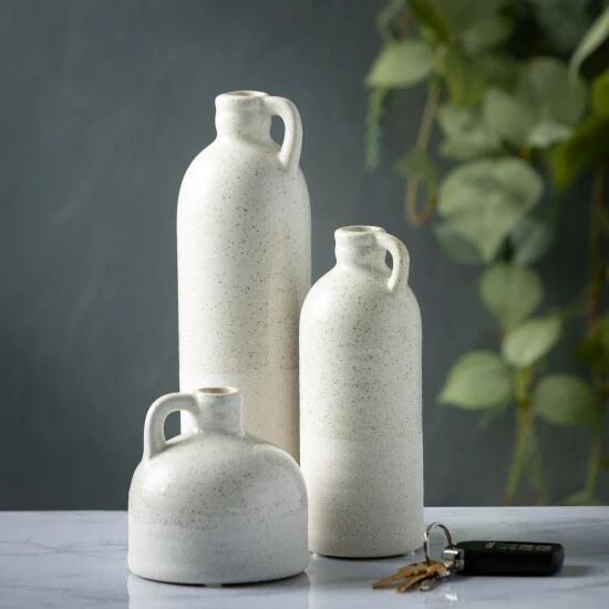 - These off-white two-toned farmhouse ceramic jugs will be the perfect addition to host your favorite faux greens or florals.