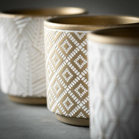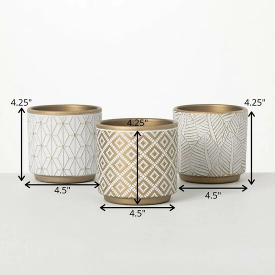 Patterns are a plenty with this refined collection of gold and cream cement basins. A sophisticated accent to any plant or botanical, these three 4.25″ tall pots will look stunning alone, and even better when filled with whatever you desire. Over the last 52 years, Sullivans has become an industry leader in home decorations. Our brand is rooted in tradition while incorporating modernized trends to keep your home looking up to date with timeless style. Here at Sullivans, we pride ourselves on creating product designs focused on quality and value, ensuring that our customers have access to beautiful products at reasonable price points.