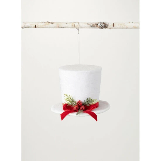 Our oversized glittered white foam snowman hat is not only shatterproof, but makes a charming edition to any tree. Adorned with three red jingle bells, a velvet cherry red ribbon, and sprigs of pine, this ornament is sure to bring a smile to everyone’s face.