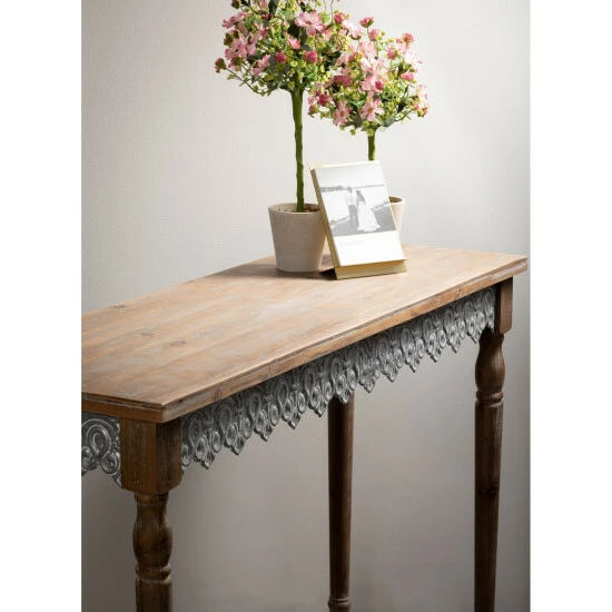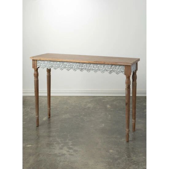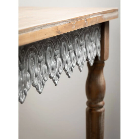 - Table is crafted of high-quality wood and features a metal, scalloped detail