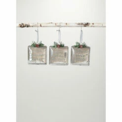 These dimensional square ornaments with rounded corners feature a dusting of faux snow encased inside. Topped with frosted evergreen and pinecones, each piece features it’s own seasonal saying imprinted on the front. Over the last 52 years, Sullivans has become an industry leader in home decorations. Our brand is rooted in tradition while incorporating modernized trends to keep your home looking up to date with timeless style. Here at Sullivans, we pride ourselves on creating product designs focused on quality and value, ensuring that our customers have access to beautiful products at reasonable price points.