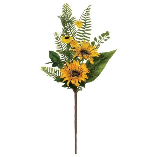 Vivid golden sunflowers add a pop of color amidst the greens of this bright floral pick; making it the perfect way to add a little sunshine to your decor. The realistic combination of florals and foliage will look cheerful placed in a simple vase or set up as a festive centerpiece on the table.