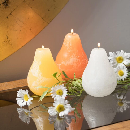 - Clean burning, odorless, smokeless, hypoallergenic, environmentally friendly, water clear and real wax pear-shaped candle