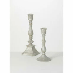 Taking inspiration from the classic taper candlestick holder, this set of two look like they are cast from heavy metal, but are indeed constructed of lightweight and easy-to-care-for polyresin. Measuring about 6″ around, they stand 12.5″ and 16.5″ tall.