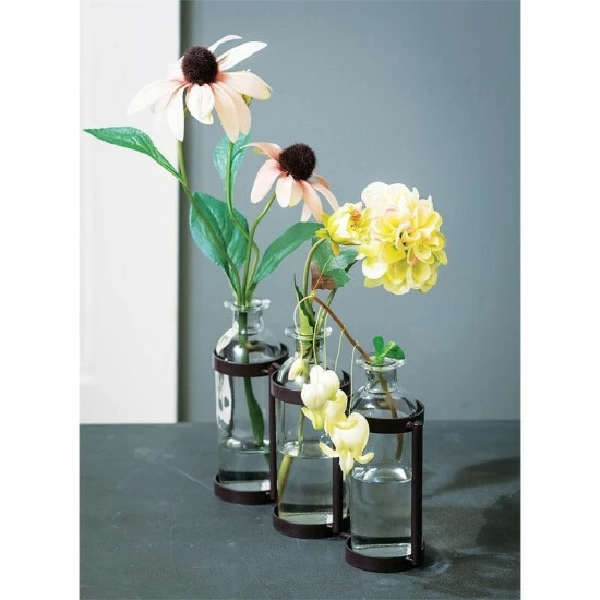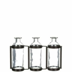 Simple centerpieces can surely be stunning, and this trio proves just that! Pairing classic shaped glass bottles with a modern metal connected frame, you can add fresh or artificial flowers to a table and still be able to see your guests over your design.