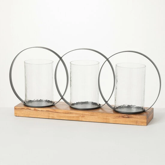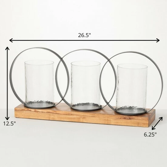 Featuring a unique, striking profile, this modern triple pillar candle holder makes a dramatic centerpiece. Featuring a wooden base, glass sleeves and circle hoop accents, it measures 26.5″ x 6.25″ x 12.5″. Over the last 52 years, Sullivans has become an industry leader in home decorations. Our brand is rooted in tradition while incorporating modernized trends to keep your home looking up to date with timeless style. Here at Sullivans, we pride ourselves on creating product designs focused on quality and value, ensuring that our customers have access to beautiful products at reasonable price points.