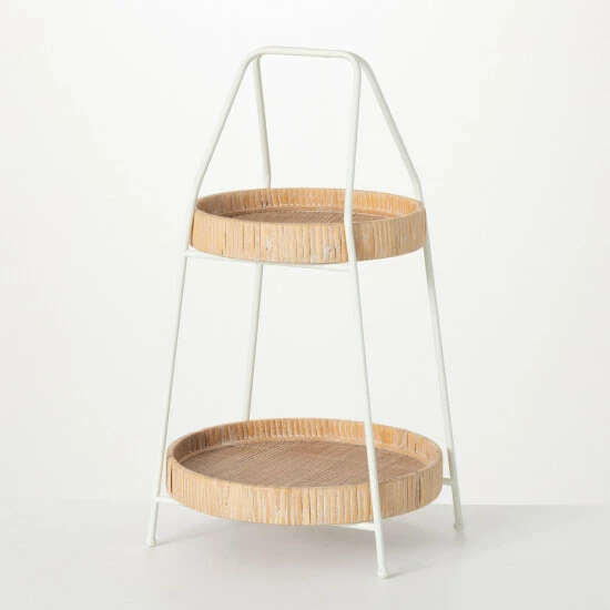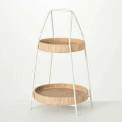 - 2-tiered riser features a simple white frame and unique rattan-inspired trays’