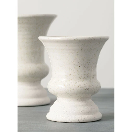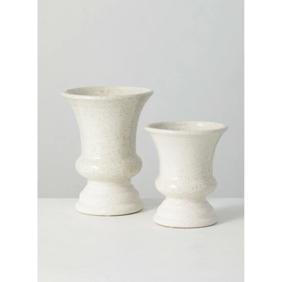 Terracotta; clay; and even concrete have unique properties of being sustainable; safe; durable and versatile enough for every style! The speckled pattern and gloss/matte finish of these white containers are both modern and classic. Dimensions are: 6″L x 6″W x 8″H, 5″L x 5″W x 6″H.