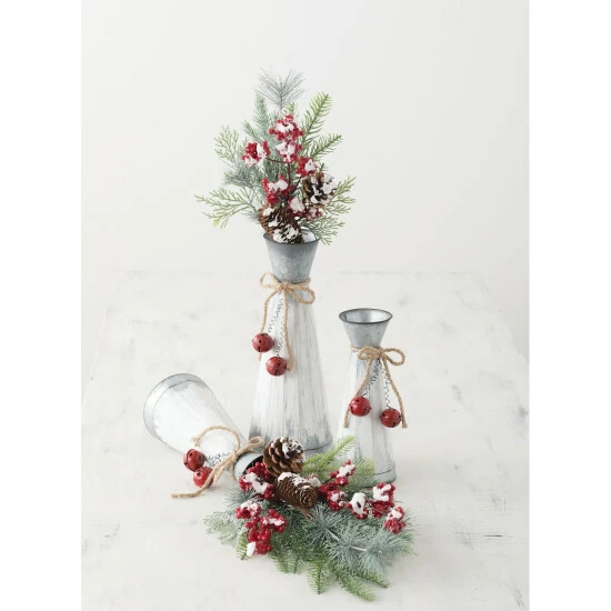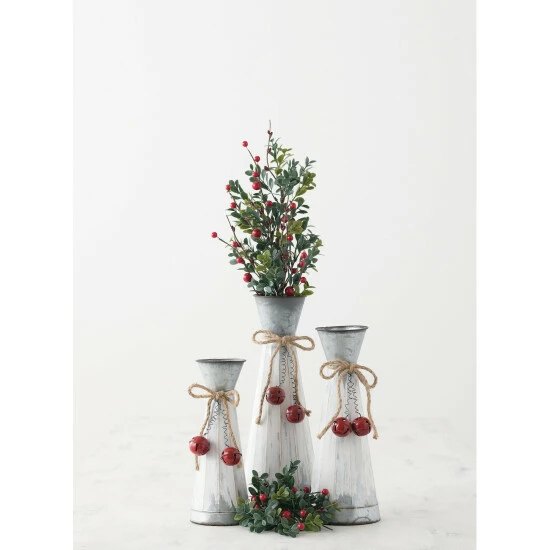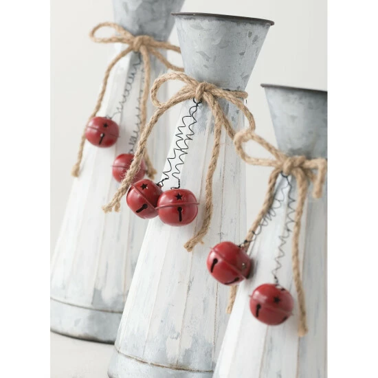 Serve up a little primitive Christmas spirit this season with this set of metal vessels on display front and center. With details like a whitewash finish on galvanized metal, and a jute fiber ribbon supporting a spring of wire with red jingle bells attached, you can fill these containers, but why would you even want to?