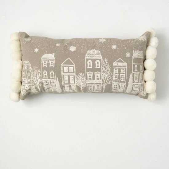 Printed and embroidered on an elegant neutral-hued pillow, this rectangular textile features exclusive Sullivans artwork that is silkscreened and embellished with loop yarn stitching. For added effect, this village-scene cushion is accented with pompoms in each of the four corners. Over the last 52 years, Sullivans has become an industry leader in home decorations. Our brand is rooted in tradition while incorporating modernized trends to keep your home looking up to date with timeless style. Here at Sullivans, we pride ourselves on creating product designs focused on quality and value, ensuring that our customers have access to beautiful products at reasonable price points.
