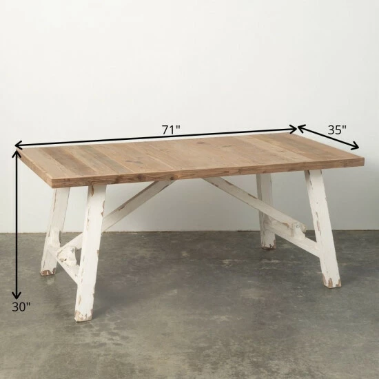 Everyone will love coming to dinner at this charming casual table. Featuring weathered white washed legs, and a natural wood top, it measures an ample 35″ x 71″ x 30″. Over the last 52 years, Sullivans has become an industry leader in home decorations. Our brand is rooted in tradition while incorporating modernized trends to keep your home looking up to date with timeless style. Here at Sullivans, we pride ourselves on creating product designs focused on quality and value, ensuring that our customers have access to beautiful products at reasonable price points.