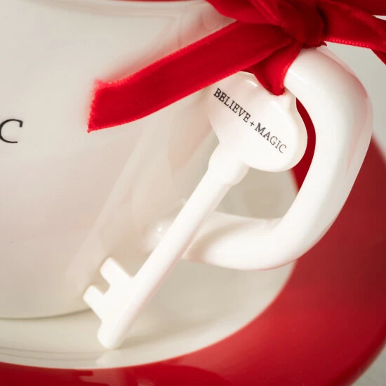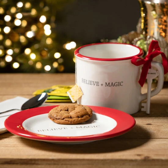 - Set of 3 features a key, mug and snack plate all adorned with text reading ‘Believe + Magic’