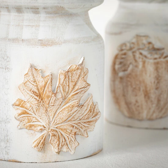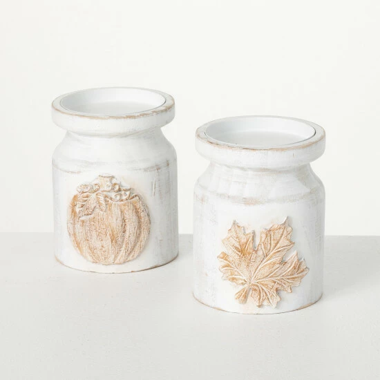 Whitewashed wooden pillars featuring raised, carved harvest symbols, make for iconic accessories for the fall season. Ideal for showcasing your favorite candle, this pair looks simply incredible atop any tabletop, dining surface or mantle. Over the last 52 years, Sullivans has become an industry leader in home decorations. Our brand is rooted in tradition while incorporating modernized trends to keep your home looking up to date with timeless style. Here at Sullivans, we pride ourselves on creating product designs focused on quality and value, ensuring that our customers have access to beautiful products at reasonable price points.