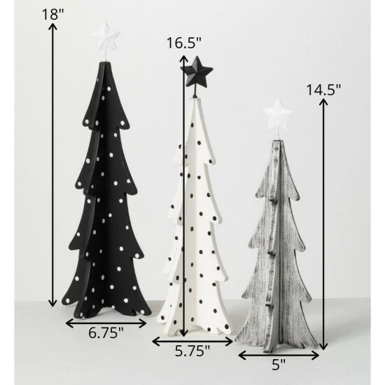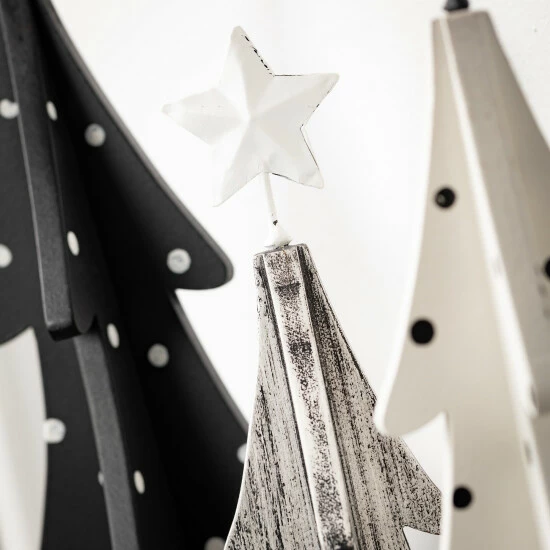 Dimensional with a modern flair of whimsy, this trio of wooden trees with metal star toppers is a fun way to decorate a shelf for the season without overdoing the classic red and green. Measuring 14.5″ to 18″ tall, they are a simple decoration that fits in anywhere.