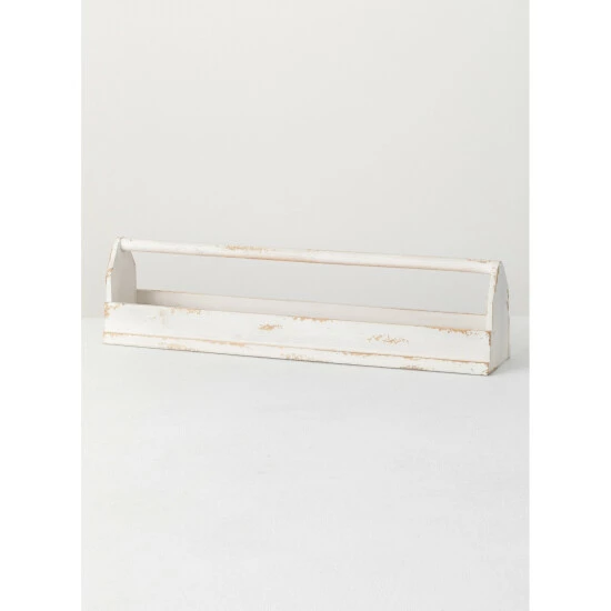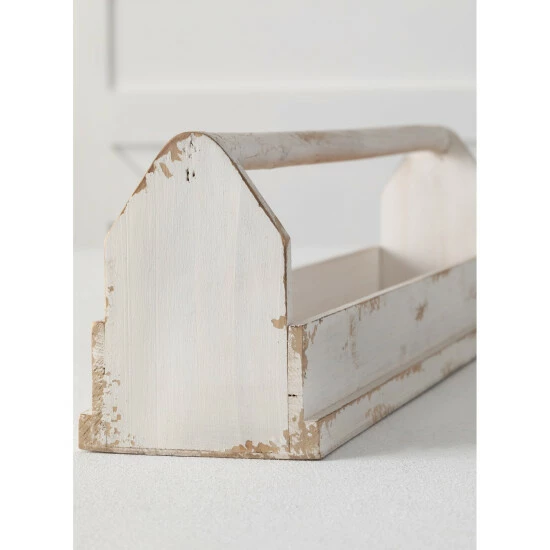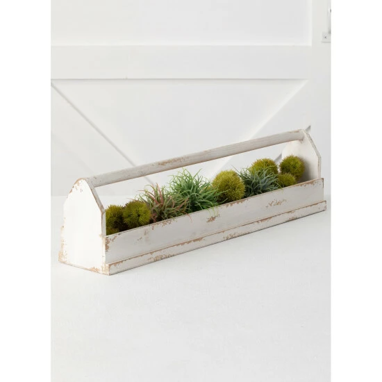 The whitewashed wood finish of this handsome table planter, makes it the ideal decorator’s showpiece. Its wooden handle extends the entire 24 length of the piece.”